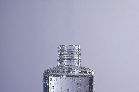 Refreshing liquid in clear glass bottle, drops of freshness visible generated by artificial intelligence