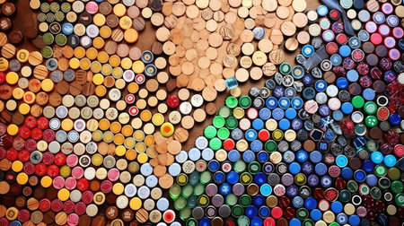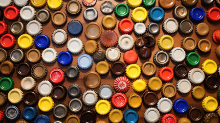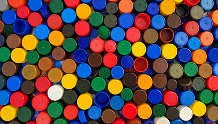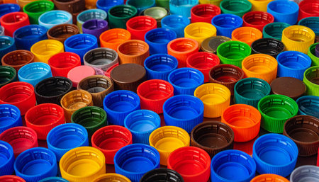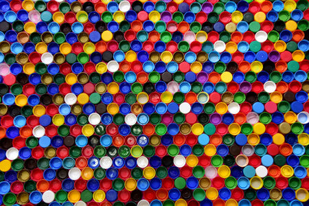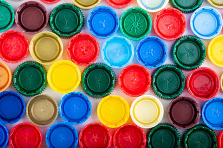 A dense arrangement of colorful plastic bottle caps viewed from directly above. Clear details and vibrant colo...