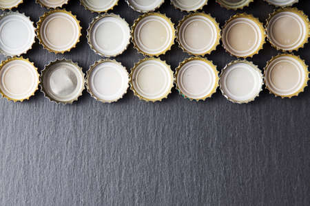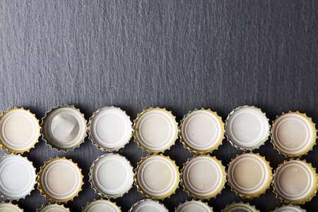 Bottle caps, side by side on black background. Collage of many small bottle caps, beer bottle caps, metal bottle caps. Closeup, texture, background