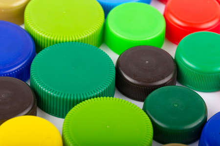 Colorful plastic bottle caps. Studio shot. Plastic waste. Isolated on a white background.
