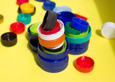 Conception of plastic processing for ecology or charity. Collection of various colorful plastic screw caps. Useful as background