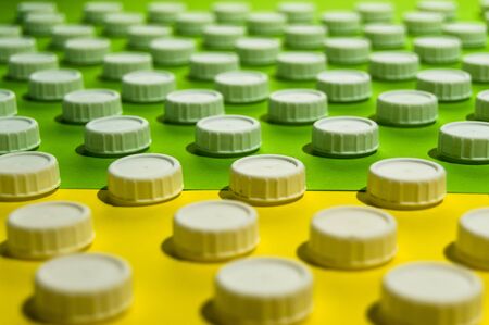 Plastic bottle caps for drinking water on a colored background. Recycling, waste separation, environmental care. Ecologycal banner.