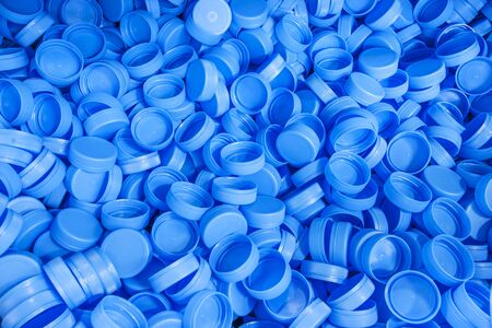 The pile of plastic caps of drinking water bottles. The plastic caps manufacturing concept.