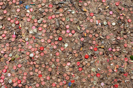 Metal crown stoppers on the ground, Mosaic made of used bottle stoppers, Split, Croatia, 26.2.2015, Ground in the city park
