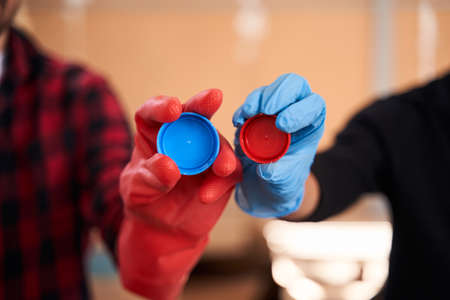 A young volunteer in yellow gloves carefully holding a bunch of colorful bottle caps while sorting trash with eco-conscious peers.