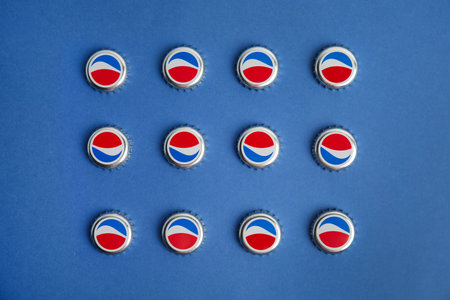 MYKOLAIV, UKRAINE - FEBRUARY 11, 2021: Pepsi lids on blue background, flat lay