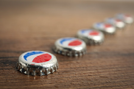 MYKOLAIV, UKRAINE - FEBRUARY 11, 2021: Pepsi lids with water drops on wooden background, closeup