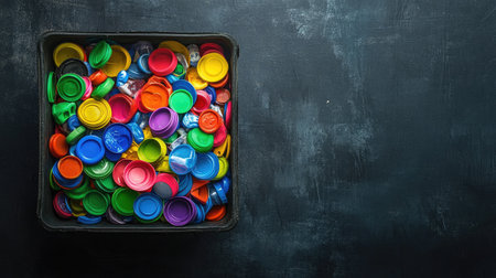 Dark container filled to the brim with recyclable plastic caps, emphasizing reuse potential