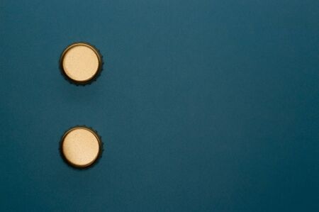 Flat lay view of blue beer bottle tops on a rustic wooden table. Home beer brewing concept with copy space .