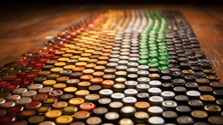 Lines of bottle tops organized on a green and yellow surface