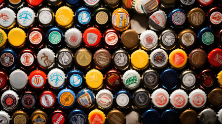 A vibrant collection of assorted beverage bottle caps arranged chaotically on a dark surface, showcasing a variety of colors and textures, perfect for creative projects.