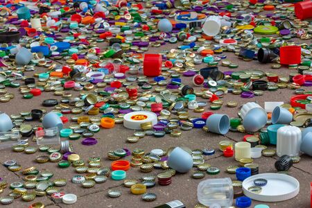 Berlin, Germany, 12.05.2018, enormous quantity of metal and plastic caps in golden, red, green, blue, white, silver etc. Recycling, environment, ecology