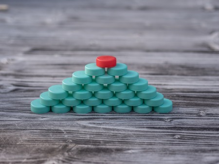 Image of different colored plastic caps on wooden background, creative concept