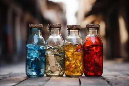 Capture an image of a row of colorful recycle bins on the street, emphasizing the concept of garbage separationThe photo should have a selective focus and be taken in a public park or city setting.