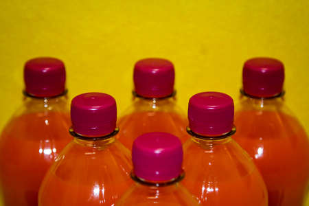 Energy drink isotonic for athletes and people who play sports. It helps to keep the body in tone during training. Yellow and blue isotonic bottle on a light backgroun with copy space