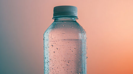 A tall glass water bottle, captured in soft lighting, with water droplets visible on the surface, surrounded by subtle, muted colors in the background.