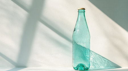 A clear green glass bottle sits on a surface, capturing sunlight and creating beautiful shadows. Ideal for concepts of refreshment and simplicity.