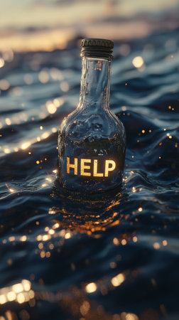 Message in a bottle with help text floating in ocean at sunset, hope and rescue concept