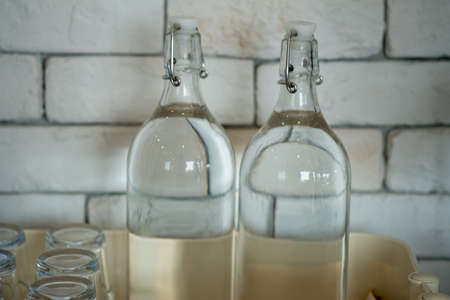Collection of glass bottles on a festive light background. Caps of bottles ready for celebration on a christmas light background.