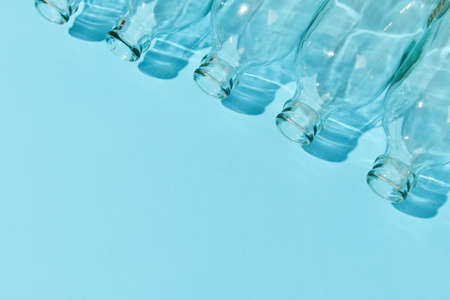 medicine concept, glass vial with medicine for injection saline dehydration rinsing close-up, blue background with copy space