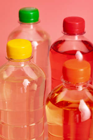 Many blue, yellow, green drinking water and refreshment beverage bottle caps and pure drinking water bottles in a drinking water production plant or supermarket shelf. Close up. Selective focus.