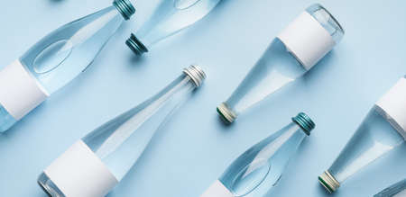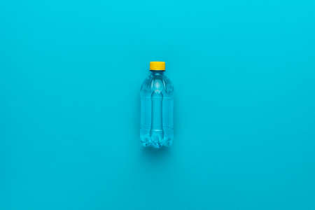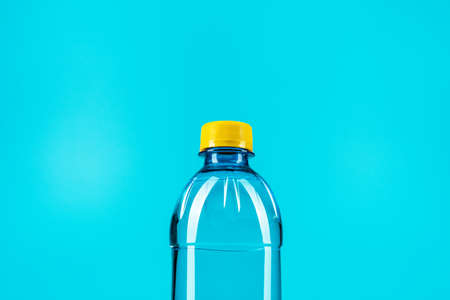 Plastic water bottle with yellow cap on the blue background. Minimalist photo of water bottle with copy space.