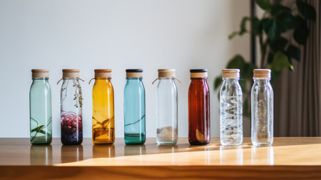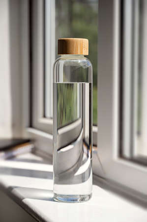 Glass water bottle with wooden lid, hush shadows, drinking water and healthy lifestyl concepts