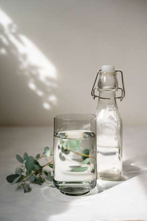 A glass bottle and a glass with water and an eucalyptus brunch, abstract summer shadows background.