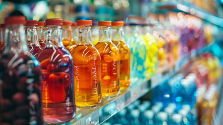 Colorful bottles of various beverages neatly arranged on a store shelf, showcasing a variety of drink options.