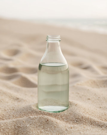 AI Generated. A bottle of water sitting on top of a sandy beach