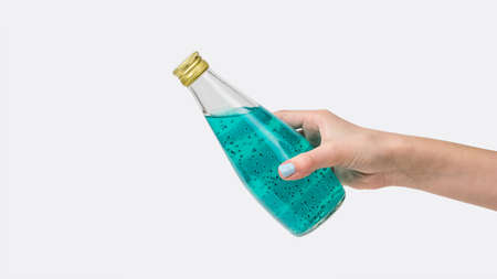 A woman's hand holds a closed bottle with a blue cocktail and basil seeds isolated on a white background. An exotic drink.