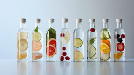 Fruit-infused water sits at the bottom while a large empty space fills the background, creating a clean wellness scene.
