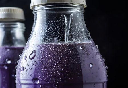 Purple smoothie or juice pouring into glass bottle with condensation and water drops