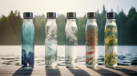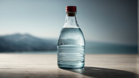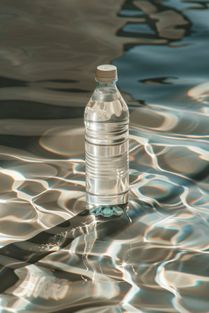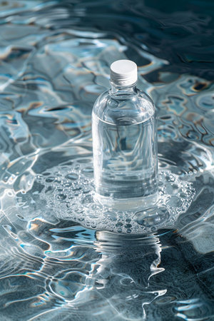 A transparent bottle of water is depicted floating on wavy water, creating a serene scene with captivating light refractions.