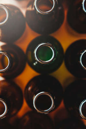 An empty green glass bottle surrounded by other brown bottles seen from above. A beam of light comes from one corner of the image.