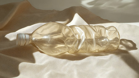 A lightweight, empty plastic water bottle slightly crumpled, placed on a subtle off-white surface, bright and neutral setting.