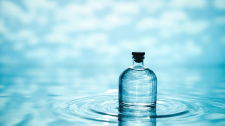 A clear glass bottle with a black stopper floats in rippling blue water against a blurred sky.