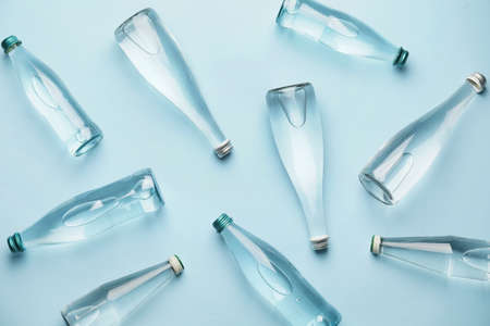 Used empty crumpled plastic bottles on blue background. Recycling recycled plastic. Pollution, environmental protection.