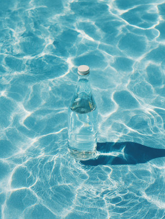 Clear Glass Water Bottle Floating in Crystal Blue Swimming Pool with Sun Glare Ripples, and Refreshing Summer Vibe for Healthy Lifestyle Hydration and Pure Mineral Water Branding Mockup Background.