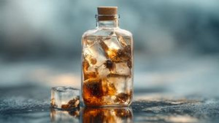 Glass bottle with ice cubes on a dark background. Selective focus.
