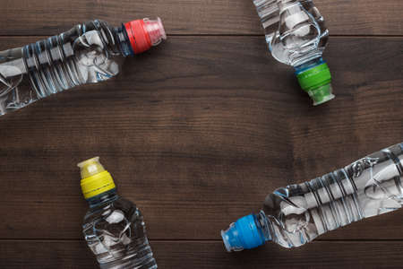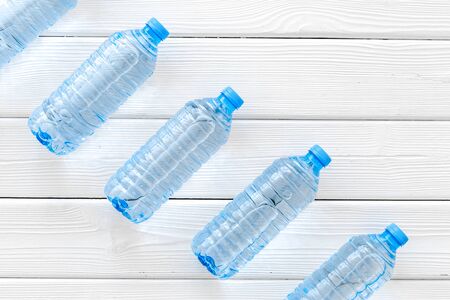 Plastic bottles with water on white wooden table. Top view