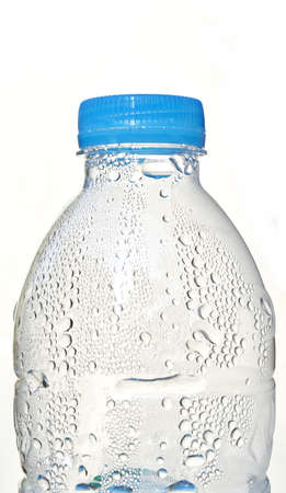 Many water drops on the surface of a transparent plastic bottle on white background