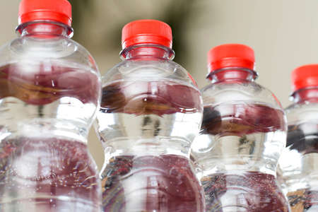 Row of water bottles, bubbling spa red, recycling environment concept close-up