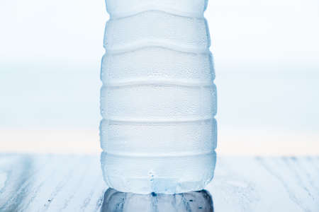 Close up view of plastic bottle full of water against blue color water background with light reflections