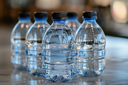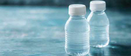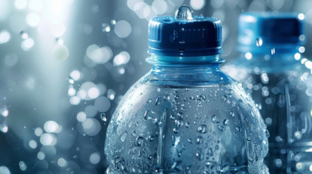 Cold water bottles with vibrant blue caps glisten with tiny droplets, evoking a crisp, invigorating vibe ideal for hydration and wellness.