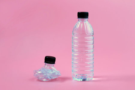 Crushed plastic drinking bottle on pink background. The idea of waste sorting, recycling and environmental pollution.
