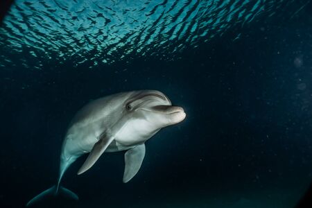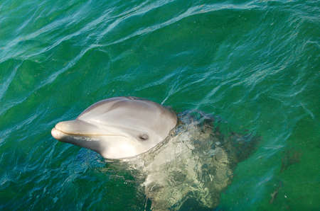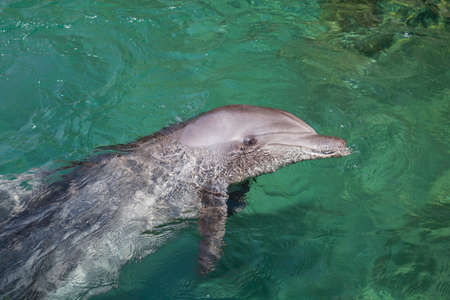 Bottlenose dolphin Tursiops truncatus swims along the shoreline of Key West, Florida in summer.