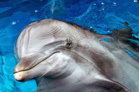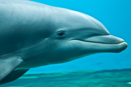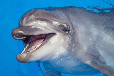 Dolphin portrait on blue background, aquarium of Genova - Italy