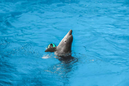 Dolphin swimming with ball in pool at marine mammal park