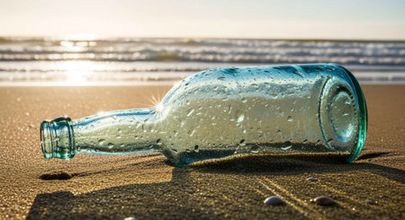 Message in a bottle washed ashore on a tropical beach.